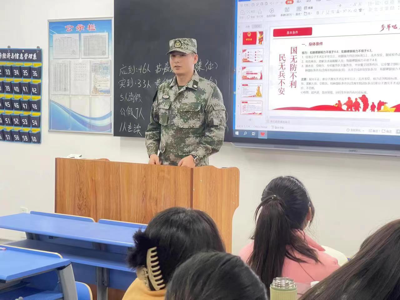 活动中,8位复学老兵向同学们讲述了自己当兵的经历,并通过现有政策和事例阐释参军入伍的好处——“政治上有前途,经济上有实惠,成长上有发展”。同时也现身说法,从部队的纪律、伙食、津贴等各个方面为有参军意向的同学解答疑惑,并告诉他们,只要坚定信念,到了部队努力工作,勤奋上进,都会得到组织的认可,在评优、推送、报考公务员或事业单位等事情上会被优先考虑,享受优惠政策。
