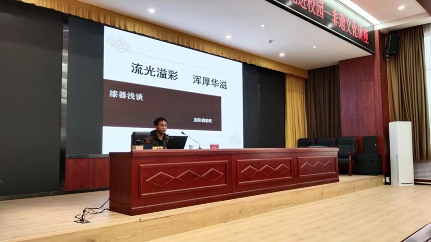 本次活动邀请到甘肃省工艺美术大师、天水飞天雕漆家俱有限责任公司总工艺师巴忠天老师为太阳成师生进行了以“流光溢彩,浑厚华滋”—中国漆器为主题传统文化讲座,学校党委副书记文云及部分师生代表参加此次讲座。