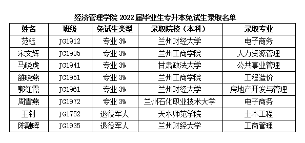 一份耕耘一份收获。在2022年 “专升本”考试当中,我院学子喜获佳绩。根据甘肃省教育考试院《2022年甘肃省普通高校高职(专科)升本科免试生招生工作实施方案》的文件要求,我院共8名专升本免试生分别被兰州财经大学、甘肃政法大学、天水师范学院、兰州工商学院、兰州石化职业技术大学录取。