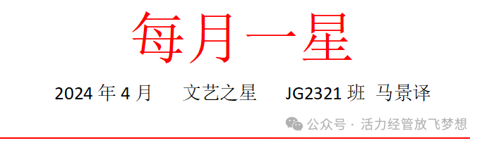 马景译同学来自太阳成集团官方网站JG2321班,现代物流管理专业。他性格活泼开朗,兴趣广泛,尤其在文艺方面有显著特长。